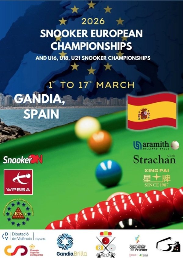On behalf of the EBSA Board of Directors and the Real Federaciòn Española de Billar (RFEB), I have pleasure to inform you of the details of the 2026 European Snooker Championship and U16, U18, U21 Snooker Championships that will be held at the Gandia Palace Hotel, from the 1st to the 14th of March 2026 in the city of Gandia/Spain.