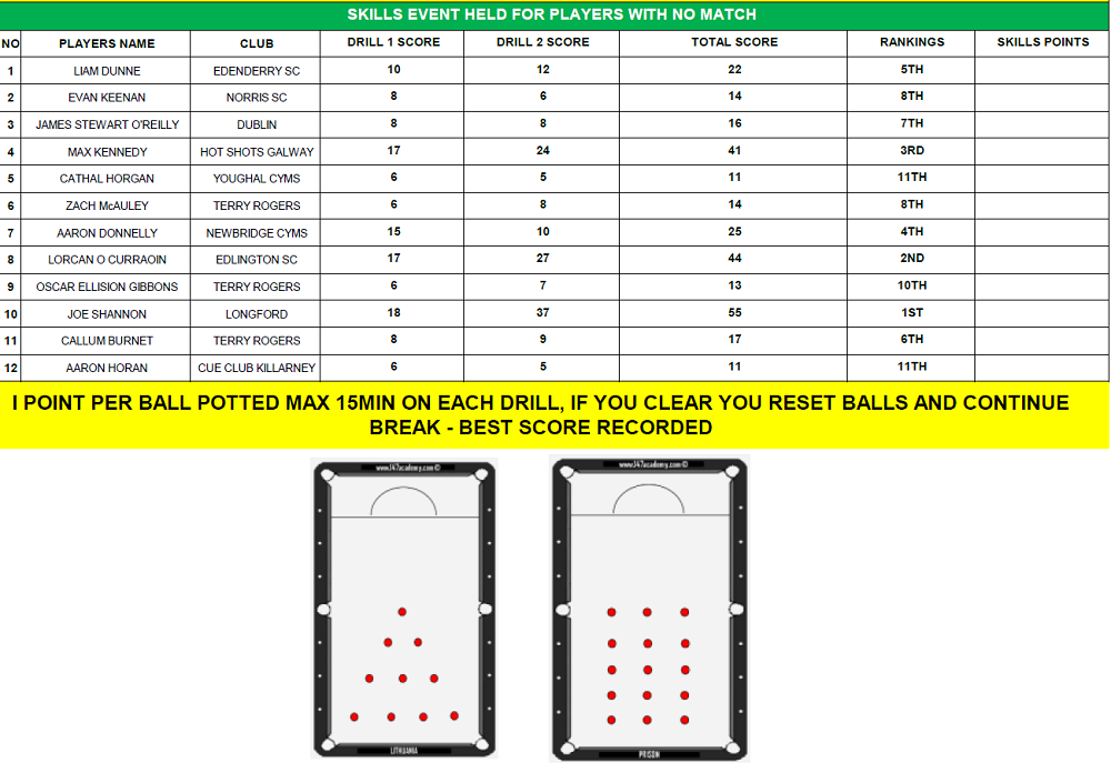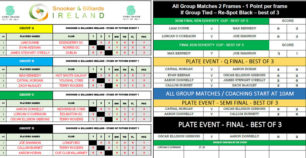 SBI also held a Stars of the Future Plate event for all the players who did not qualify from the group. The standard was excellent with Aaron Donnelly from Newbridge CYMS winning the event when he beat Oscar Elision Gibbons 2 frames to nil.